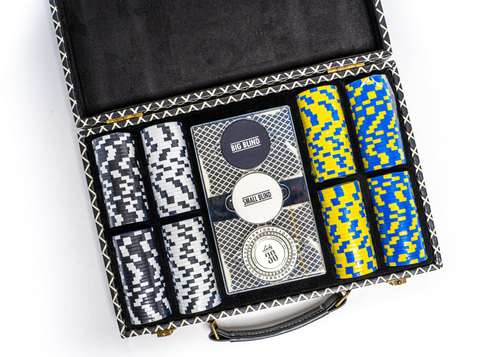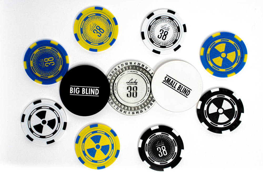 Dieses luxuriöse Pokerset ist von dem Denkmal inspiriert, das Mr. House gebaut hat. Das Set enthält 200 Pokerchips, zwei Decks mit Lucky-38-Karten, Big- und Small-Blind-Chips, eine geprägte Dealer-Münze aus Metall und ein individuelles Etui.