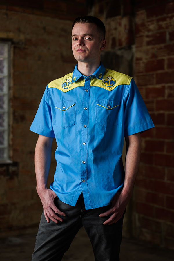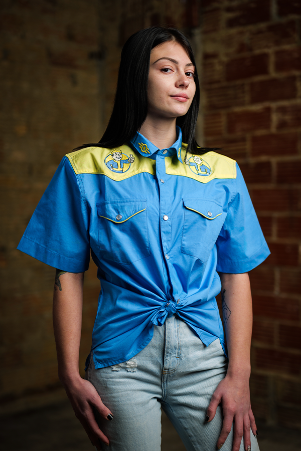 Bienvenido a los Páramos Salvajes, un mundo árido al borde de la civilización. Es el hogar de la suciedad, los forajidos y el ganado mutante. En esta nueva frontera, necesitarás el equipo adecuado para sobrevivir. Y si eres de los que luchan, se baten en duelo y se abren camino a tiros, te sentirás como en casa con tu camisa vaquera abotonada Vault-Tec de Fallout™ .
